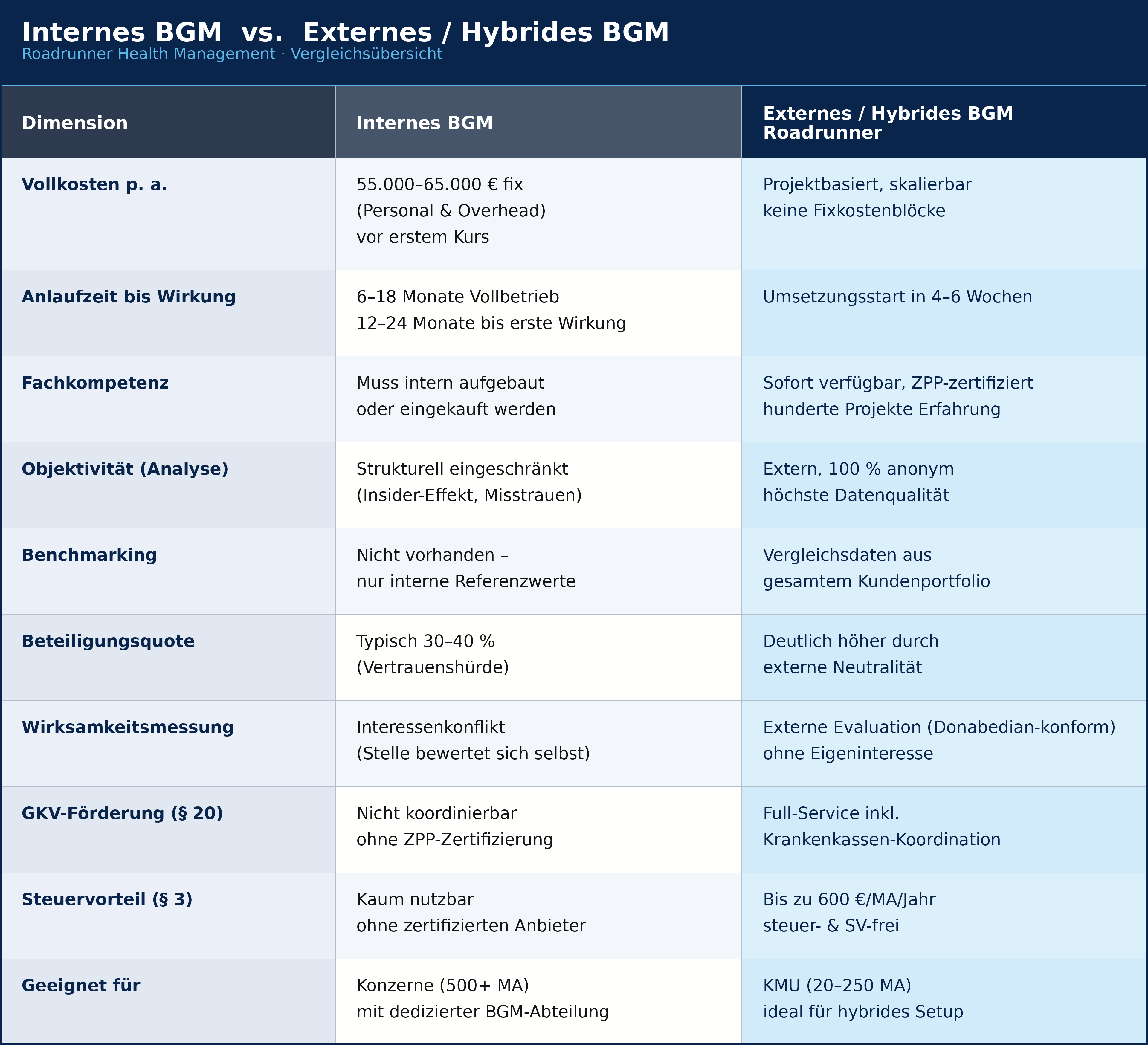 Best Practice in KMU ist weder 100 % intern noch 100 % extern – es ist die intelligente Verknüpfung beider Welten. Roadrunner Health Management hat diesen hybriden Ansatz als Standard etabliert.